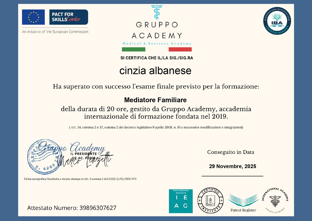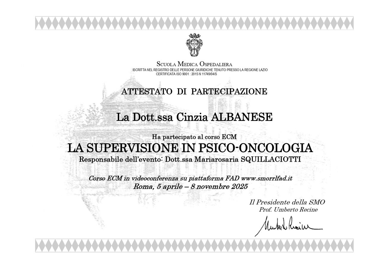 Laureata in Psicologia e Pedagogia,svolgo anche la professione da insegnante,formata in Psicologia scolastica ,Master in Psicologia del lavoro e delle organizzazioni con approfondite competenze in contesti multidisciplinari promuovendo il benessere psicologico sia a livello individuale che organizzativo. Ho competenze approfondite in psiconcologia e cure palliative per adulti e adolescenti.Valuto interventi sui loro bisogni emotivi ,comportamentali e relazionali con particolare attenzione anche alle loro famiglie e caregiver,affrontando ansia ,depressione e gestione del dolore.Mi occupo inoltre con formazione specifica in Psicologia delle sostanze e non, di creare percorsi individuali per ogni singolo paziente.Mi avvalgo anche della collaborazione della Psicologa Dott.ssa Rossi Nicoletta Psicoterapeuta in formazione,specializzata in mindfulness,coach educational,ipnosi clinica e regressiva,miriamo ad una promozione del benessere nel team di lavoro.